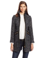 60% Wool/30% Polyester/10% Viscose Imported Dry Clean Only 33 inch center back length Stand collar Front zip closure Faux leather detail at waist Zip front pockets