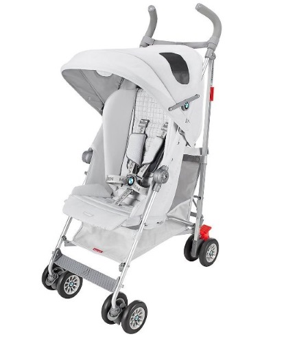 5-point harness with BMW insignia buckle keep child safe and comfortable, includes a removable, ergonomic bucket seat liner for cushioned comfort Carry strap, foot-operated linked brakes, lockable front swivel wheels, one-hand, compact umbrella fold, carry strap foot-operated linked brakes, lockable front swivel wheels One-hand, compact umbrella fold, high performance aluminum chassis, removable washable seat fabric
