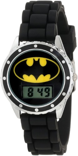 Round silver-tone watch with Batman logo on dial and rubber link band Quartz movement with digital display Protective glass crystal dial window Features buckle closure Not water resistant